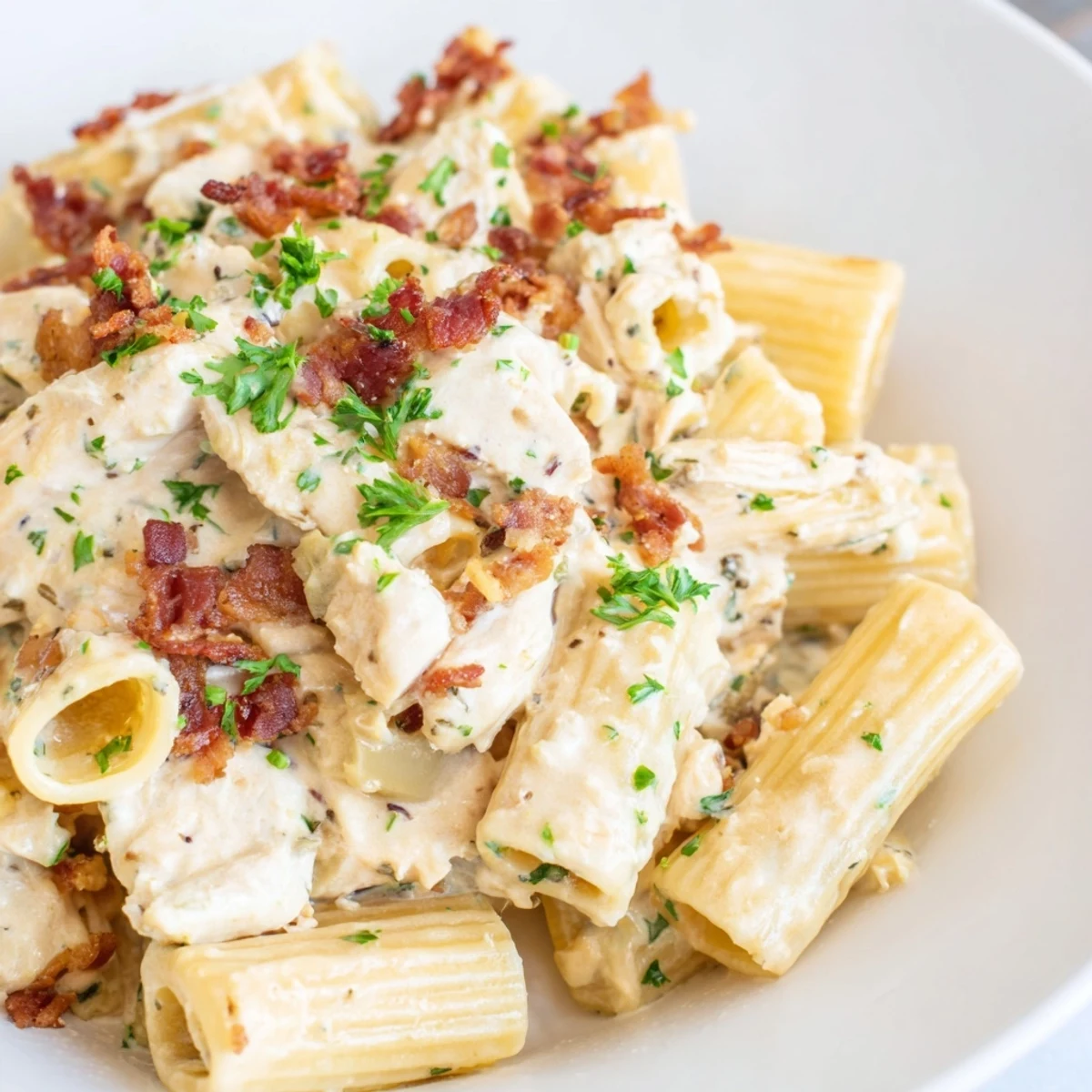 Indulge in this luxurious pasta dish that combines succulent seasoned chicken with a velvety smooth cream cheese and cheddar sauce. The crispy beef bacon adds a savory crunch, while fresh parsley and chives bring brightness to every bite. Perfect for weeknight dinners or special occasions when you want something deeply satisfying.