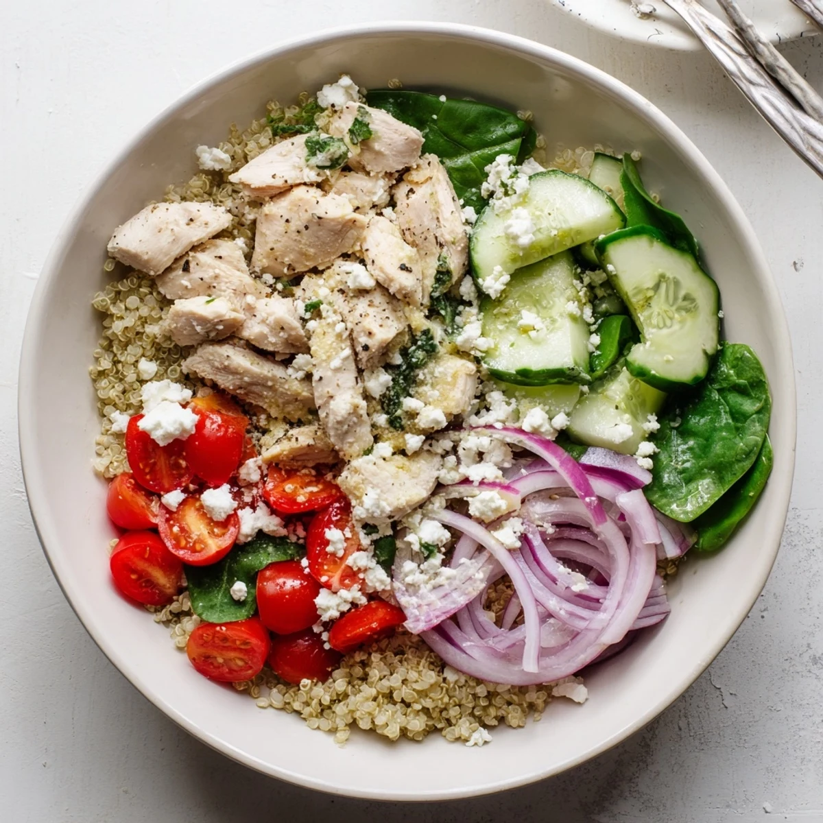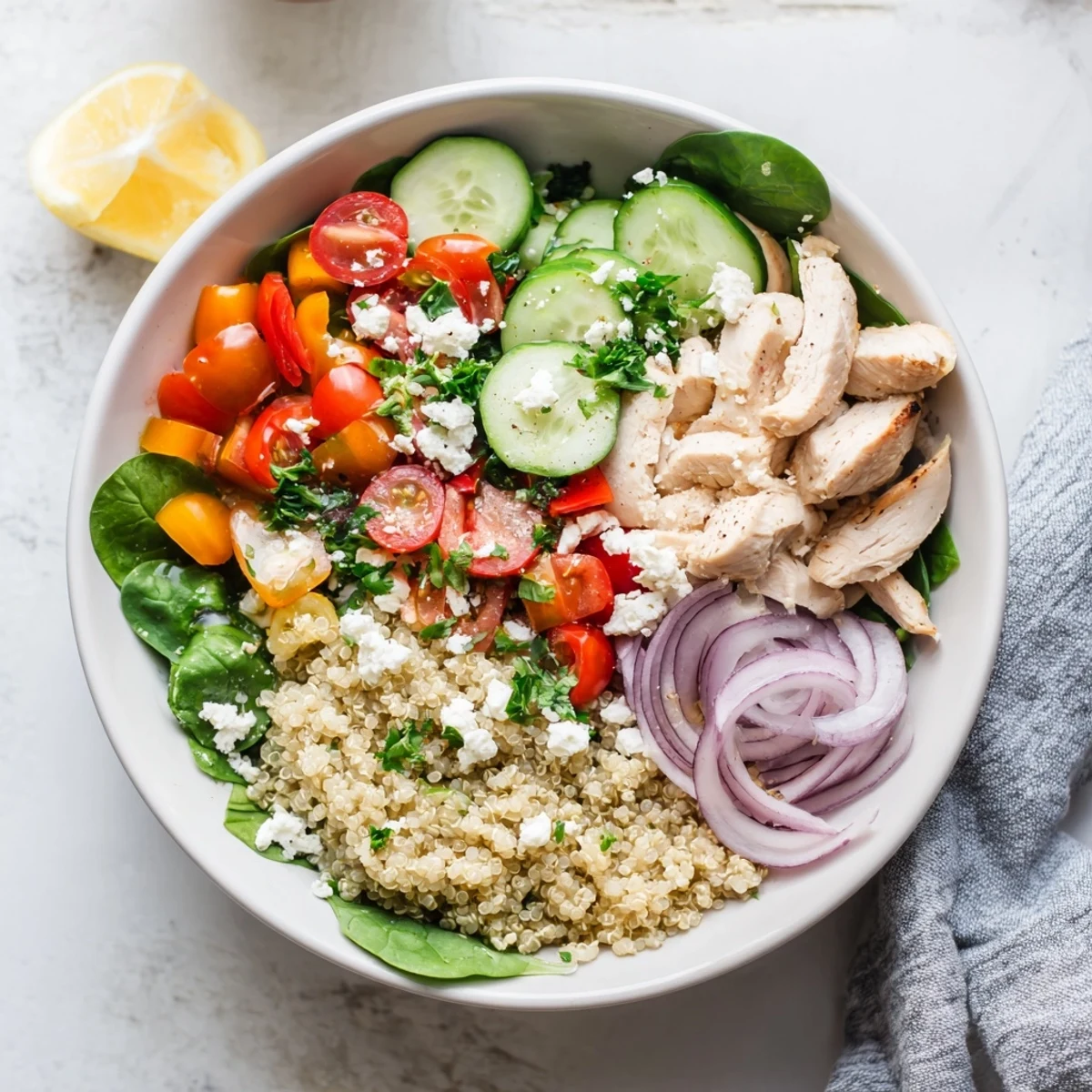 This wholesome bowl combines succulent pan-seared chicken breast with perfectly cooked quinoa, creating a protein-rich foundation that's both satisfying and nutritious. Fresh cherry tomatoes, crisp cucumber, vibrant bell pepper, and red onion add crunch and color, while baby spinach provides essential nutrients.
