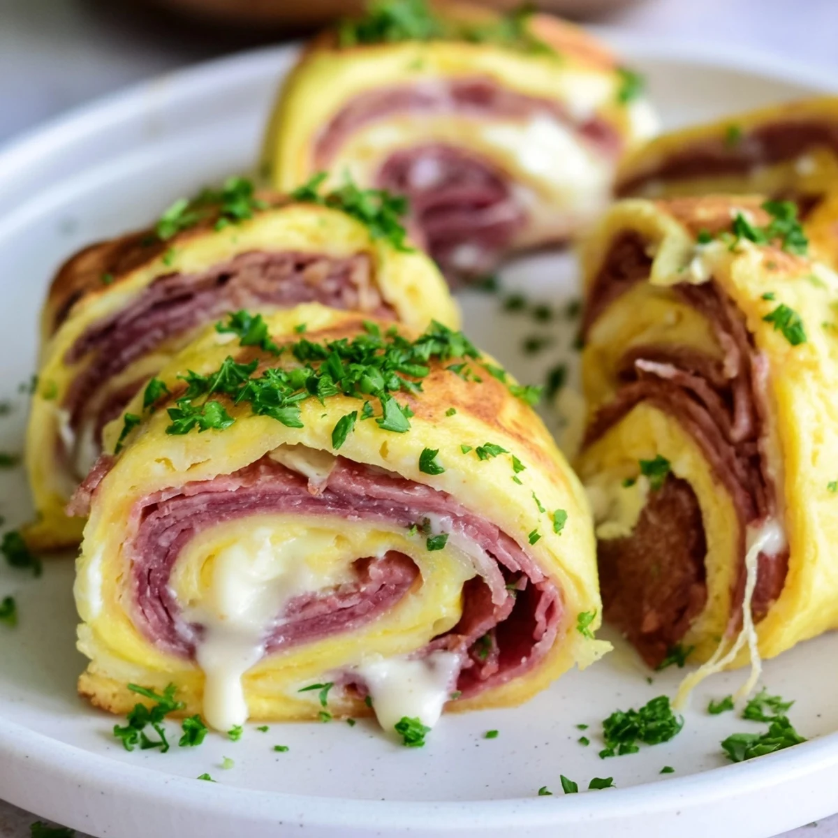 These clever roll ups capture all the beloved flavors of a classic Reuben sandwich without the bread. Thin, tender egg crepes replace traditional rye, wrapping around layers of savory corned beef, tangy sauerkraut, melted Swiss cheese, and creamy Russian dressing. The preparation comes together in just 25 minutes, making it perfect for a quick weeknight dinner or satisfying lunch. Each serving delivers 22 grams of protein with only 5 grams of carbohydrates, keeping you full and energized. The egg wraps cook into delicate crepes that roll easily around the filling, and a quick return to the skillet melts the cheese into gooey perfection. Serve warm with extra dressing for dipping, and garnish with fresh parsley for a pop of color.