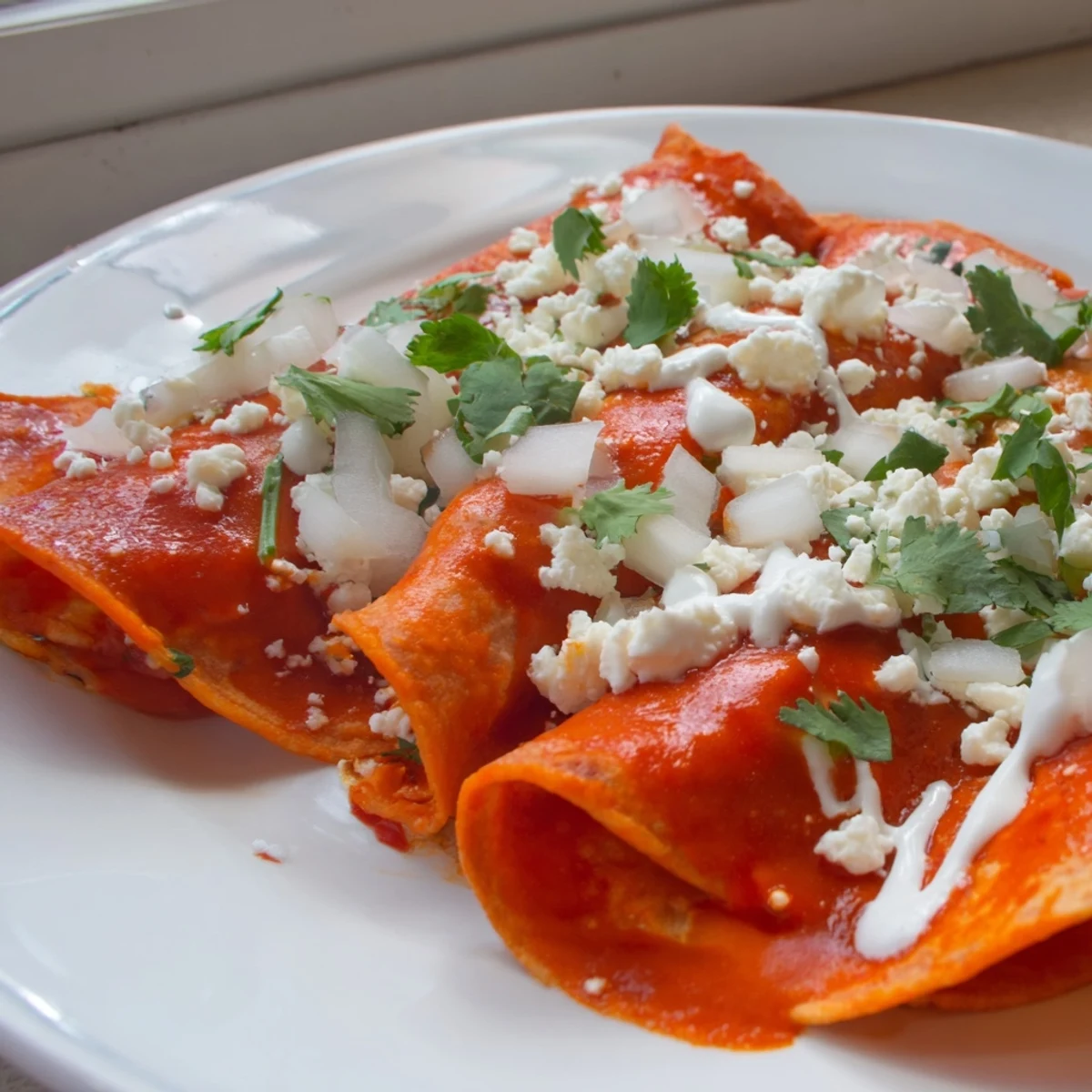 - Pile three entomatadas onto each plate and spoon over extra sauce because nobody wants a dry one. Shower them with crumbled cheese, those raw onions, fresh cilantro, and finish with a generous dollop of cream right in the center.
