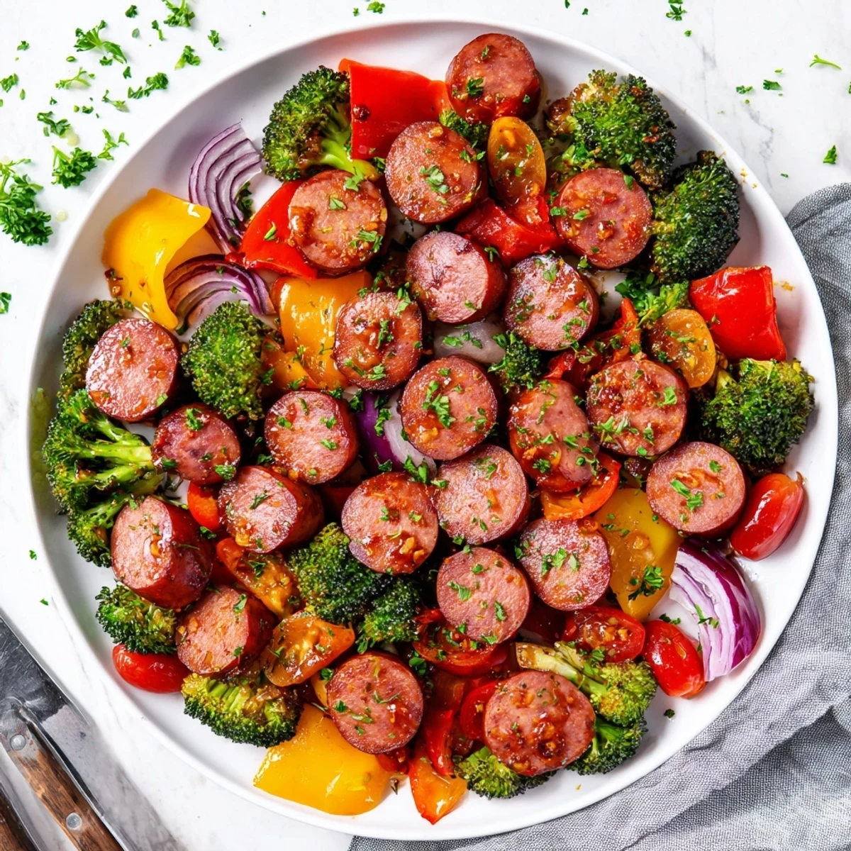This effortless one-pan meal combines smoky kielbasa sausage with vibrant broccoli, bell peppers, red onion, carrots, and cherry tomatoes. Everything gets coated in a sticky honey garlic glaze made with soy sauce, Dijon mustard, and smoked paprika, then roasted until caramelized and tender. The result is a perfectly balanced sweet and savory dinner that comes together in just 45 minutes with minimal cleanup.