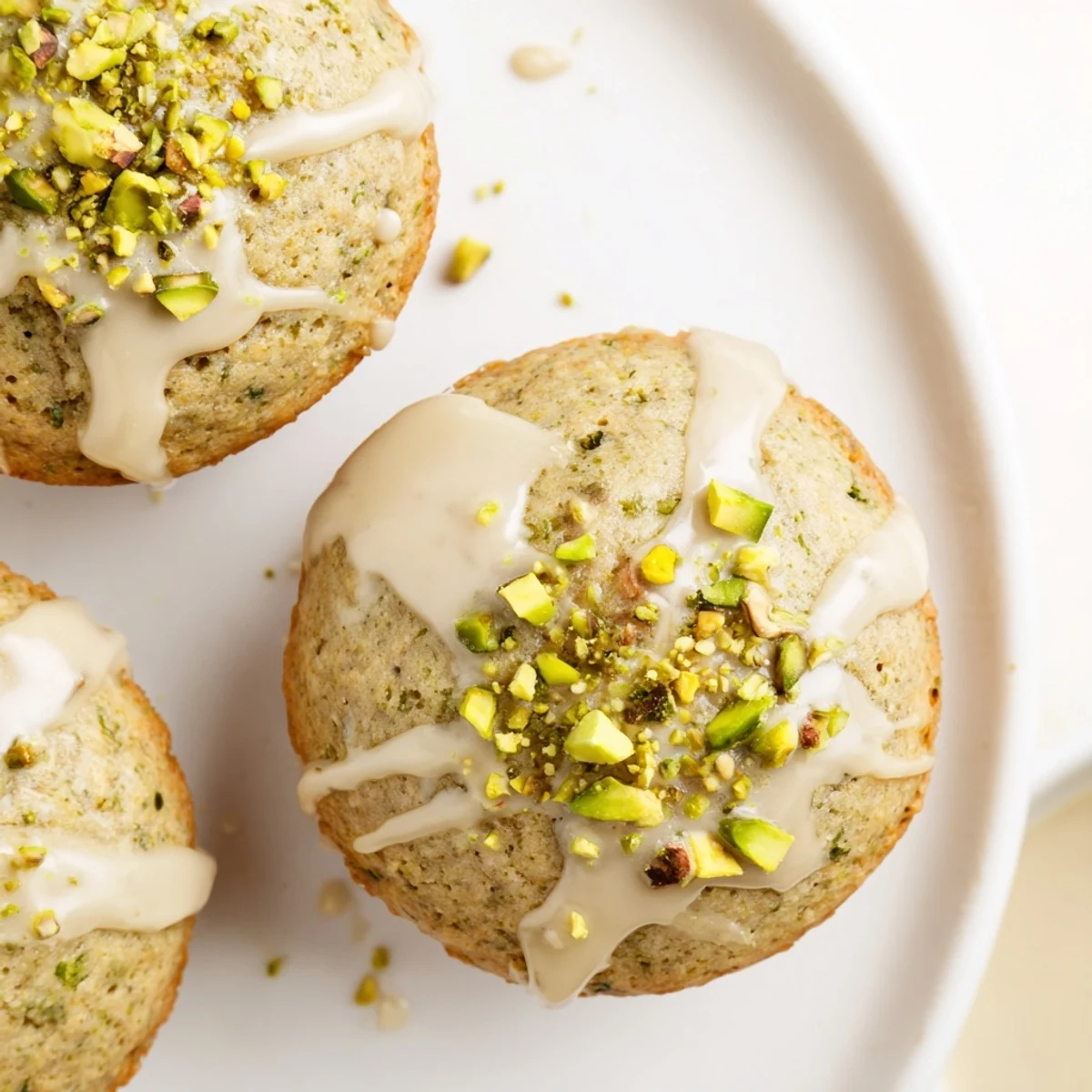 - Drizzle the glaze over each cooled muffin and immediately sprinkle with the reserved pistachios, then let the glaze set before serving.