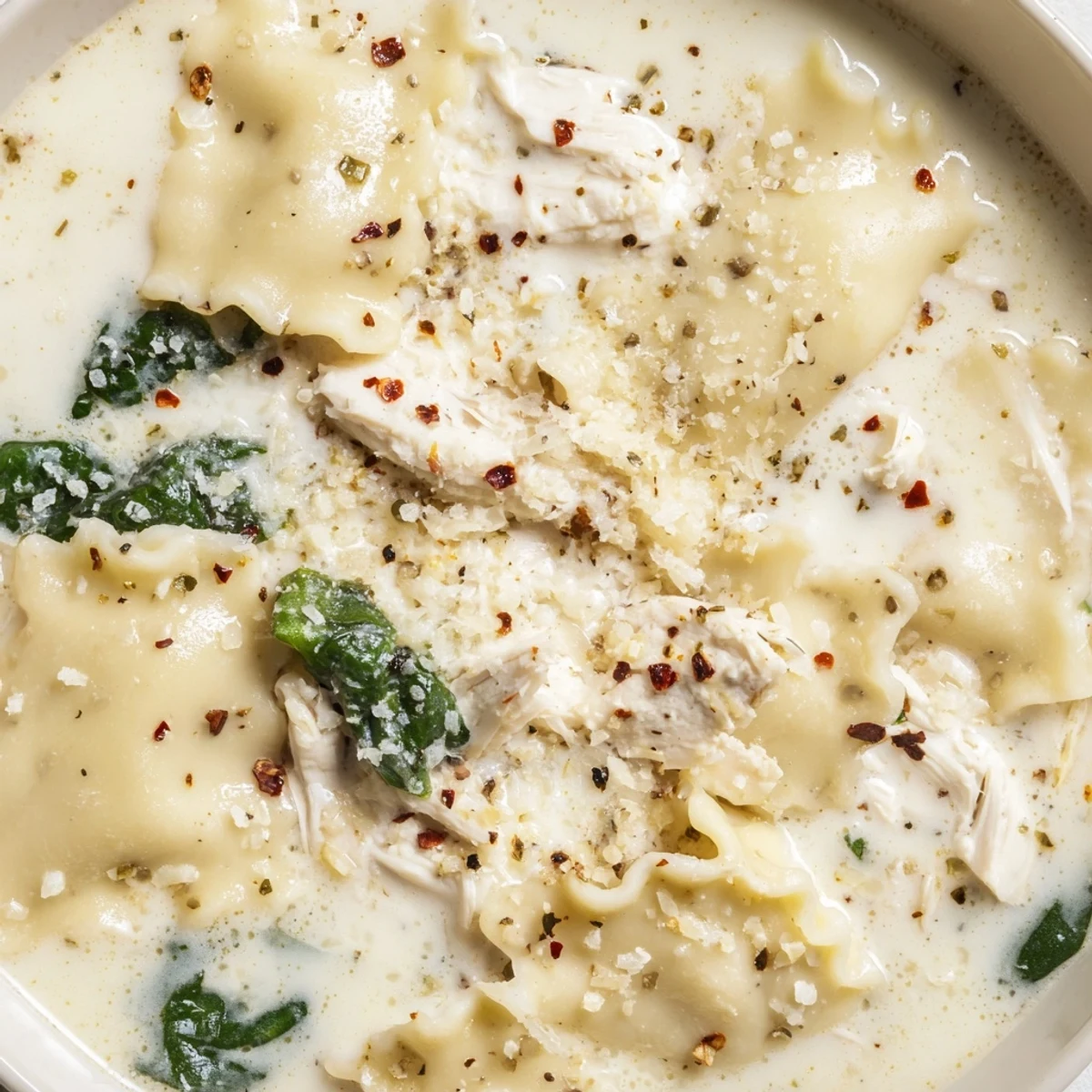 This comforting white lasagna soup transforms the classic Italian-American dish into a quick one-pot meal. Tender broken lasagna noodles simmer in a creamy broth with shredded chicken, then get finished with ricotta, mozzarella, and Parmesan for that authentic lasagna flavor. Fresh spinach adds color and nutrients while Italian herbs bring traditional seasoning.