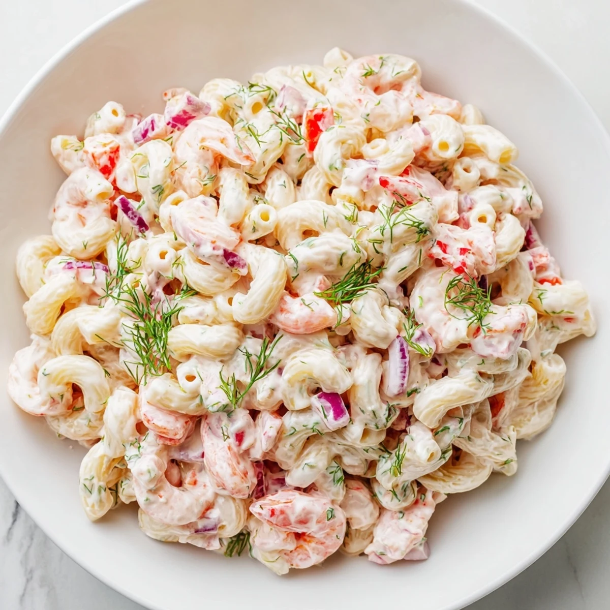 This chilled pasta dish brings together tender shrimp, al dente macaroni, and crisp vegetables in a rich, tangy dressing. The combination of mayonnaise, sour cream, lemon juice, and Dijon creates a perfectly balanced creamy coating that complements the seafood. Red bell pepper, celery, and red onion provide satisfying crunch, while fresh herbs add brightness. After chilling for an hour, the flavors meld beautifully, making it an excellent choice for picnics, potlucks, or light summer dinners. Serve over lettuce for an elegant presentation or pair with crisp white wine.