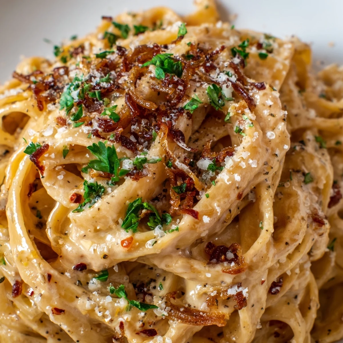 Indulge in a luxurious pasta experience where fettuccine meets perfectly caramelized onions simmered to golden perfection. The dish gets its signature sweetness from brown sugar and honey, while garlic, red chili pepper, and crushed red pepper flakes provide a gentle warming heat that lingers pleasantly.